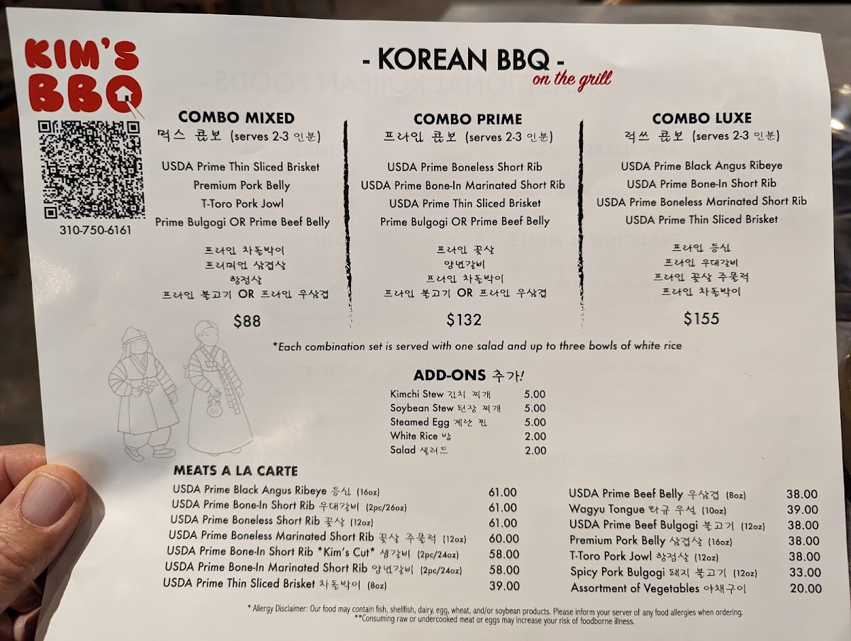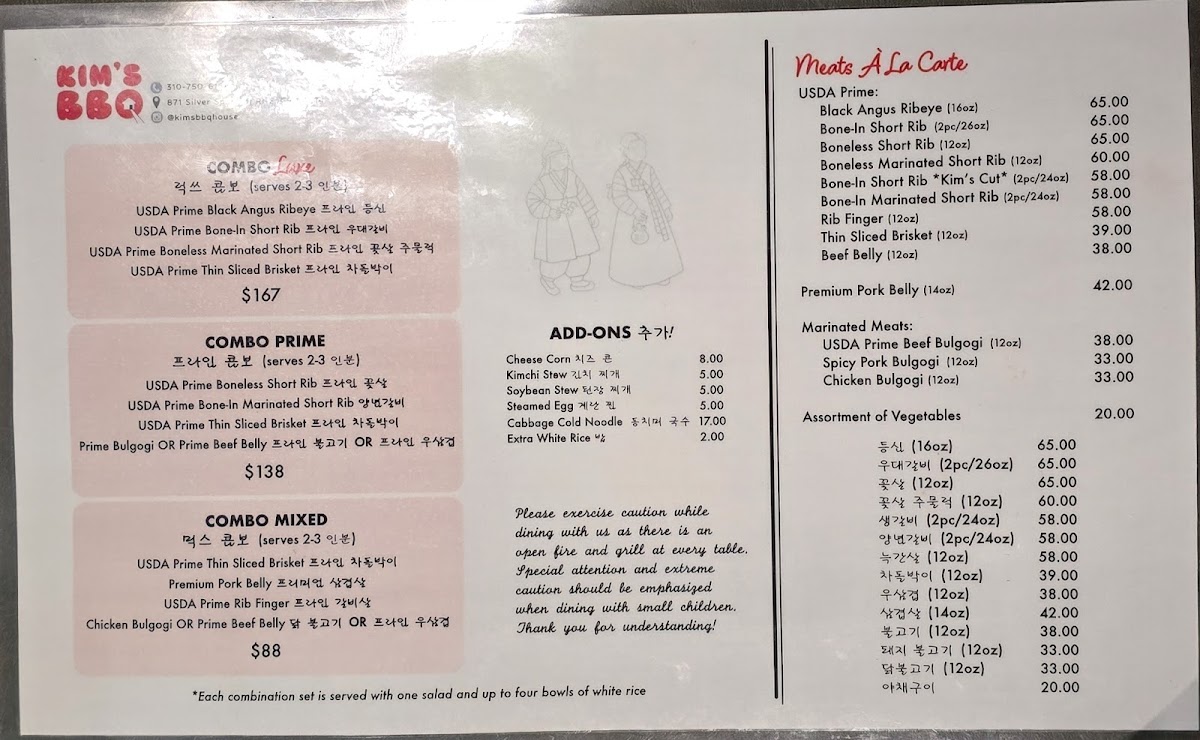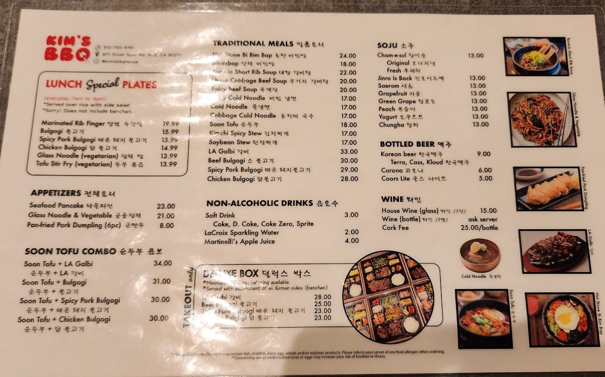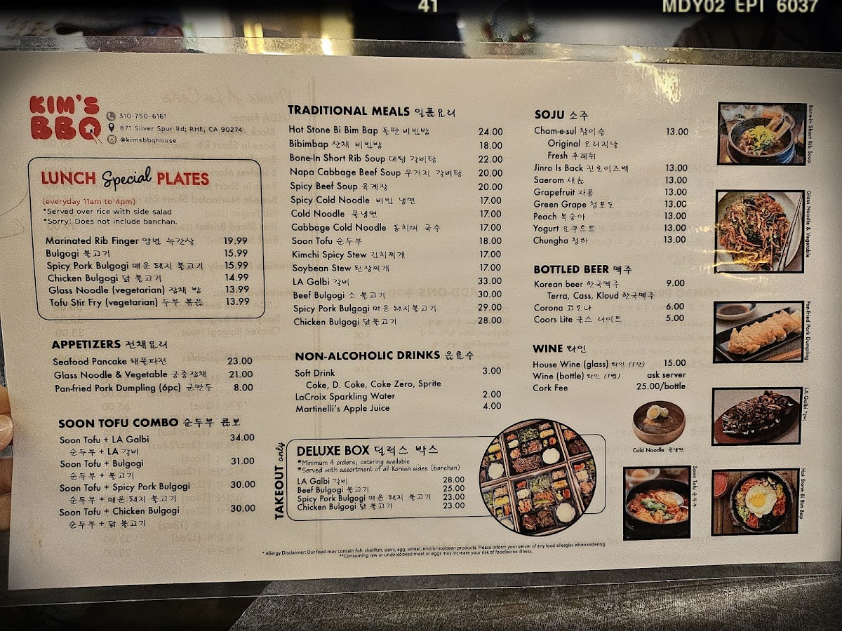 The menu at Kim's BBQ offers a thoughtfully curated selection of Korean barbecue and traditional dishes, designed to suit both leisurely dinners and casual weekday meals. Here, you can enjoy the interactive experience of grilling premium cuts of pork belly, pork jowls, and LA galbi right at your table, paired with familiar sides like kimchi, salad kimchi, and macaroni salad. The atmosphere is enhanced by the rich aromas and communal style of dining, making it a go-to spot for intimate gatherings or relaxed group meals.
